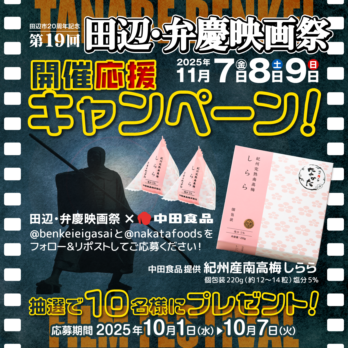 ・田辺・弁慶映画祭、中田食品【公式】Xアカウントをフォローし、本キャンペーンの投稿をリポストすることで応募の意思確認とさせていただきます。